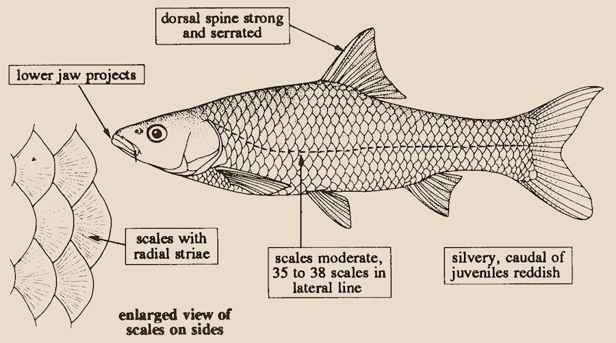 by Michael K. Oliver, Ph.D."Barbus" litamba was long classified in the genus Barbus, but is neither a proper Barbus nor a Labeobarbus. It is a predatory, fish-eating minnow endemic to the Lake Malawi basin. [Drawing above by P. Lastrico, reproduced from Eccles (1992) with permission of the Food and Agriculture Organization of the United Nations.] It used to be known as Barbus rhoadesii but Banister & Clarke (1980) showed that "B." litamba was published earlier and thus was the correct specific name. It can be readily separated from the other two "large Barbus" in the lake (Labeobarbus brevicauda and L. johnstonii) by its large, upturned mouth, concave upper head profile, radiately striate scales, and serrated dorsal fin spine (Banister & Clarke, 1980: 510, 513).